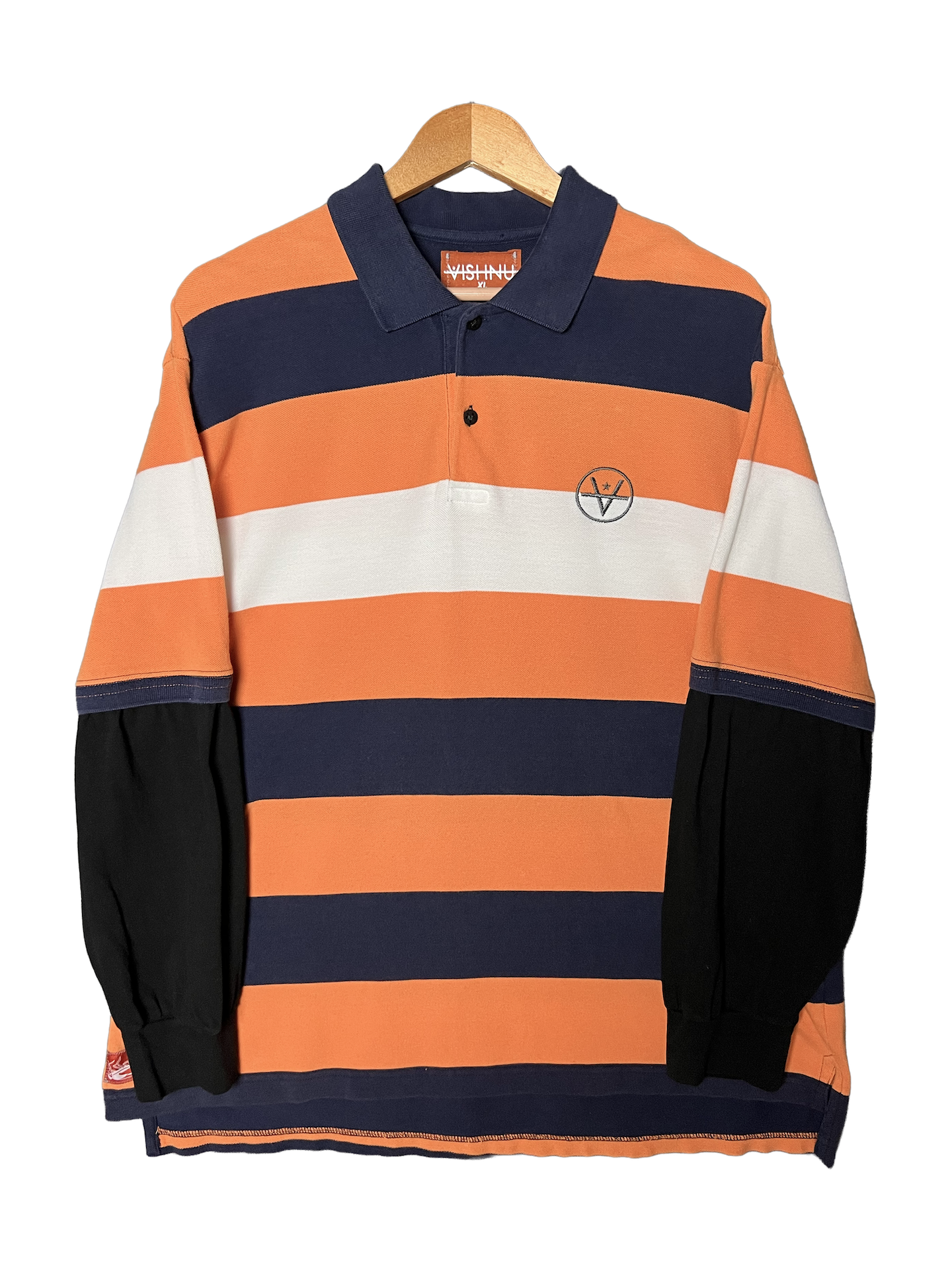 Stripe polo with black undersleeves sewn in. Circle V on left chest
